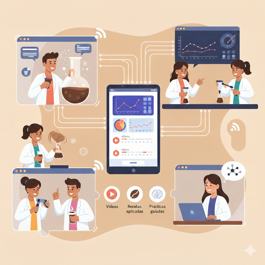 La metodología de CoffeeLab® se fundamenta en un enfoque B-Learning experiencial, que integra contenidos digitales, práctica guiada y aprendizaje sensorial. El proceso formativo combina videos instruccionales, actividades digitales, ejercicios prácticos, análisis de casos y sesiones en vivo, permitiendo al estudiante comprender el café desde la teoría hasta la aplicación real en la taza. Cada participante avanza a su propio ritmo, experimenta con recetas y variables de extracción, reflexiona sobre los resultados y comparte aprendizajes dentro de una comunidad activa. Esta metodología prioriza el aprendizaje significativo, la toma de decisiones informadas y el desarrollo de competencias técnicas, sensoriales y comunicativas aplicables al entorno profesional del café.